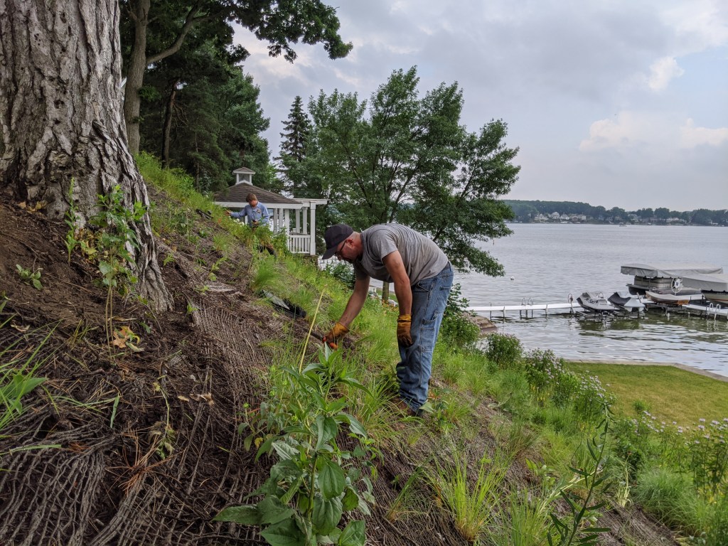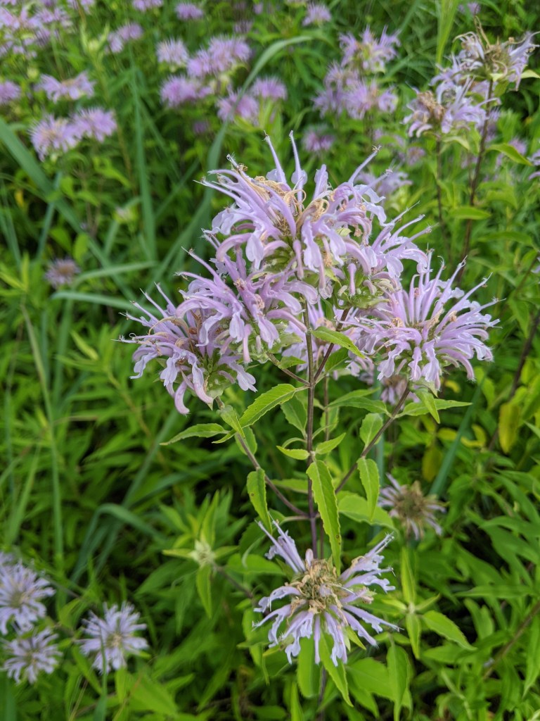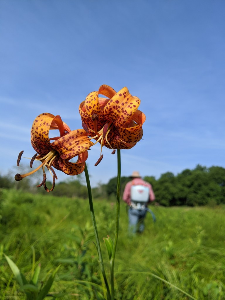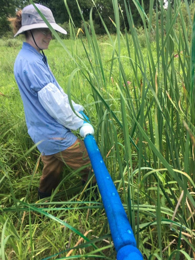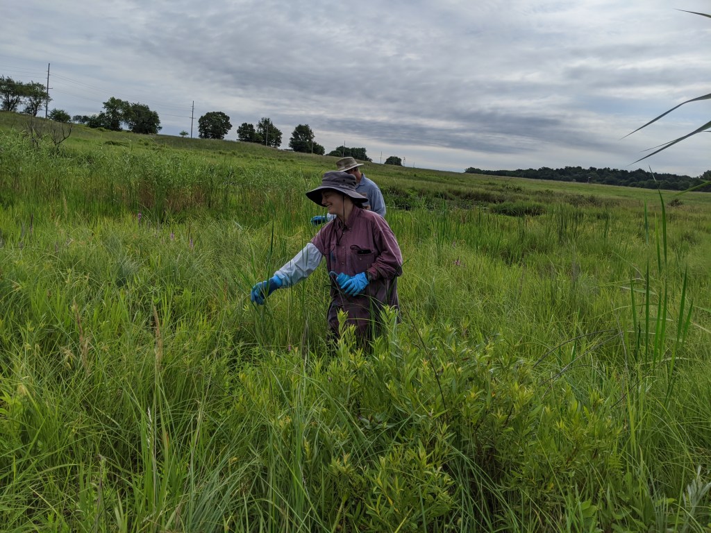 Blue vervainMichigan lilyWild bergamot/MonardaMountain mintGrass pink orchid (note the unusual location of the “lip” at the top rather than the bottom)Summer intern Cassidy Robinson looks out at Mike Metz Fen (formerly Duff Lake Fen) as John Brittenham recounts BHM’s successful efforts of restoring the former cow pasture to a landscape featuring fen, sedge meadow, wet prairie, upland prairie, and oak woodland communities – July 7, 2020Dave Drogos (front) and Josh Hall (back) plant native plants at Bill and Judy Greffin’s Clear Lake residence – July 10, 2020Josh Hall applies herbicide to a dense stand of non-native cattails at IDNR Div. of Nature Preserves’ Marsh Lake Nature Preserve – July 15, 2020Emily Schmidt and Nate Simons (taking the photo) push the herbicide-coated, two-person wick through a patch of non-native cattails at IDNR Div. of Nate Preserves’ Lime Lake Nature Preserve – July 20, 2020Cassidy Robinson and John Brittenham use the “glove-of-death” technique to apply herbicide to non-native cattails in a fen at the John Bachelor farm – July 21, 2020