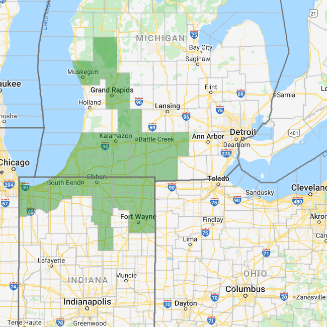 We work in all sorts of environments, located all over the The Lake Country ecoregion, as determined by the EPA. The Lake Country spans over northeast Indiana, parts of northwest Ohio, and south central and southwest Michigan. According to the EPA: